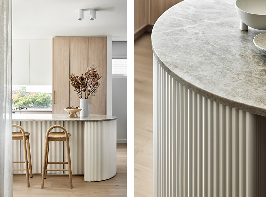Renovated by Kate Lawrence Interiors, this contemporary Maroubra Beach Penthouse features a stunning curved island that pairs perfectly with the neutral tones and smooth lines of the space. Using Surround by Laminex Demi Round 20 in Dulux Lexicon Quarter, the gentle curves of the island add to the welcoming feel and usable flow of the kitchen, creating a space for entertaining and connection.
