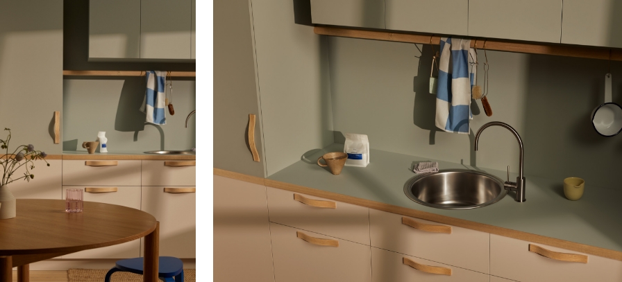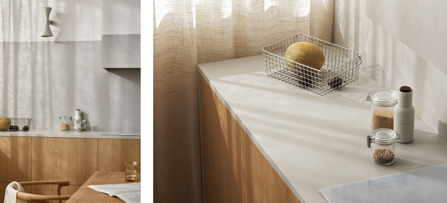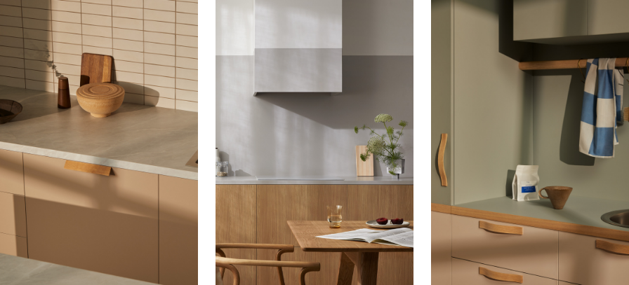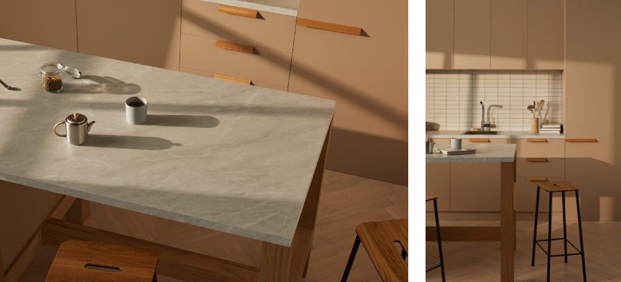 Laminex Luxe Elba TrueScale (Digital Edging ABS Edging) benchtop and Peruvian Clay joinery. Laminex Oyster Grey (InvisiEdge ABS Edging) benchtop and Aged Ash joinery. Laminex Spinifex AbsoluteMatte benchtop and joinery with timber edge and Aires in AbsoluteMatte joinery.